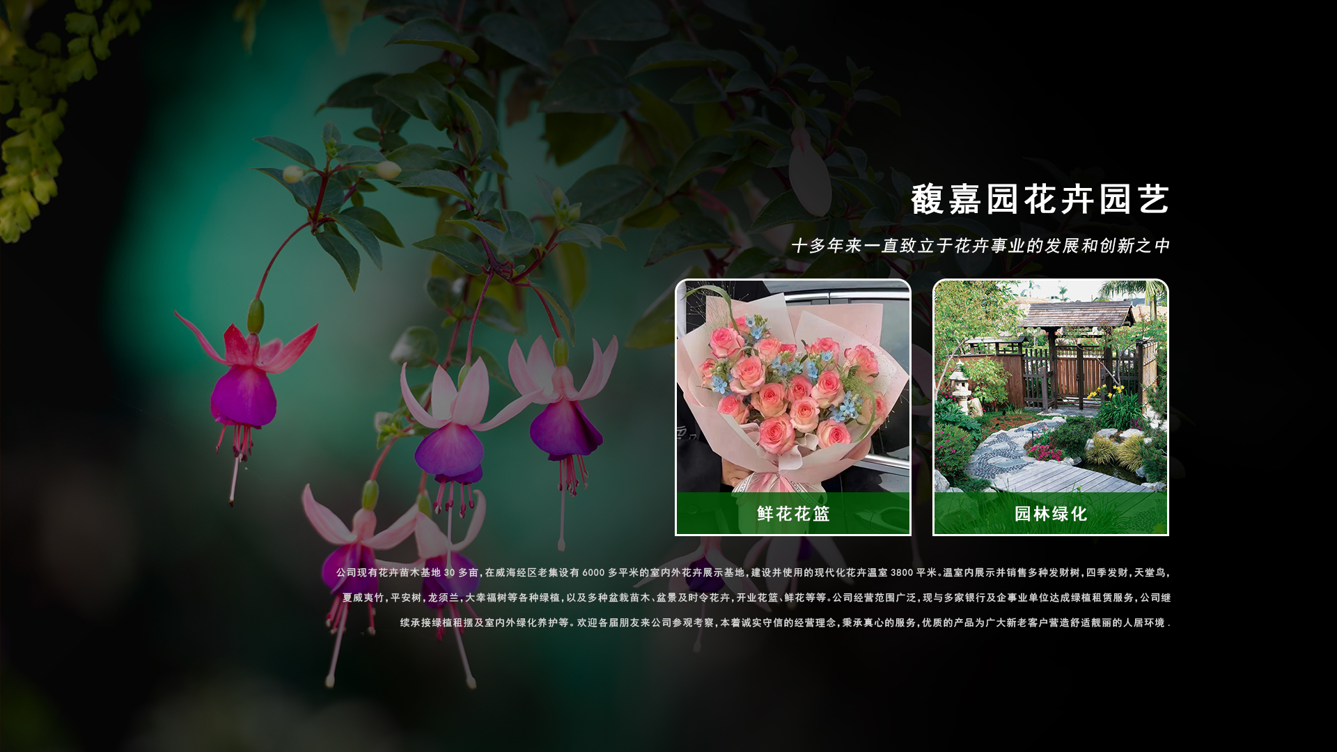 威海市馥嘉園花卉園藝有限公司成立于2009年,十多年來一直致立于花卉事業的發展和創新之中。公司現有花卉苗木基地30多畝,在威海經區老集設有6000多平米的室內外花卉展示基地,建設并使用的現代化花卉溫室3800平米。溫室內展示并銷售多種發財樹,四季發財,天堂鳥,夏威夷竹,平安樹,龍須蘭,大幸福樹等各種綠植,以及多種盆栽苗木、盆景及時令花卉,開業花籃、鮮花等等。公司經營范圍廣泛,現與多家銀行及企事業單位達成綠植租賃服務,公司繼續承接綠植租擺及室內外綠化養護等。